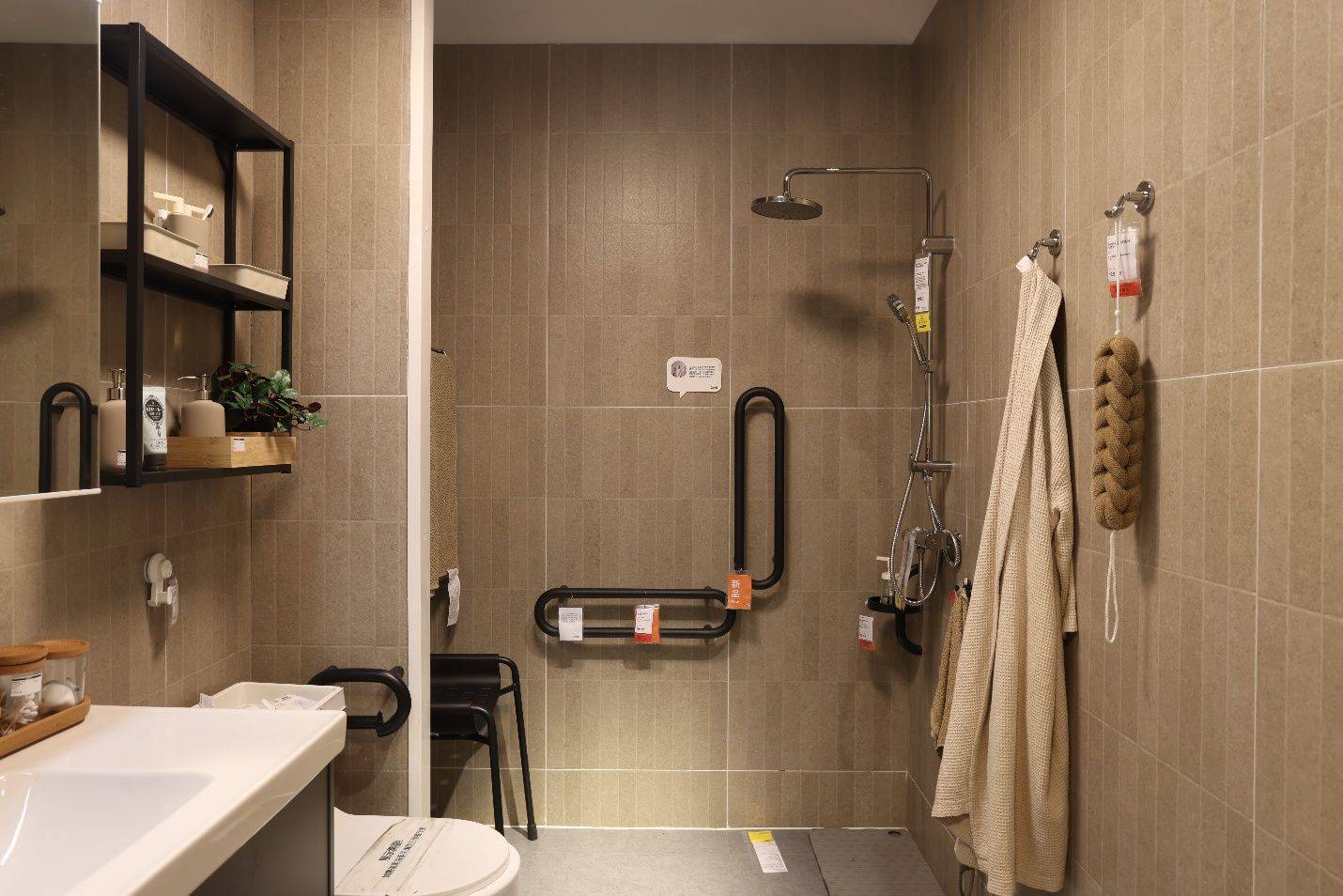 同时,本次展间改造也响应了国家适老化政策导向与市场需求变化,聚焦“完整睡眠”解决方案和代际友好空间设计。为了设计出切实满足老人家居需求的方案,宜家重庆商场的设计师探访老年人家庭,面对面了解老年人的需求与困扰,以为老年人提供安全、环保、方便的家居环境为首要目的,打造了一间适老化卧室展间。在展间中,宜家为老人在马桶旁安装了安全扶手,方便起身;衣柜的挂杆比平常的略低,方便老人拿取衣物;抽屉设置在腰部位置,避免弯腰;床头安装了感应灯,方便老人夜间走动。这些贴心的细节设计体现了宜家对于老年群体日常生活的关怀,以及改善其家居状态的愿望与解决方案。
